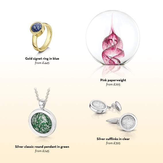 All Ashes into Glass® products come in different metals and stone colours, and optional engraving. Metals include Silver, and White & Yellow Gold.