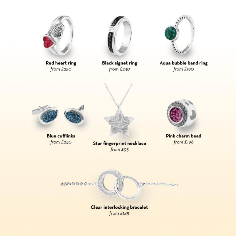 EverWith™ are the UK’s largest memorial jewellery company, offering over two hundred different products lovingly crafted, some of which ashes are set into special resin. You are able to choose from an extensive range including bespoke rings, bracelets, earrings, lockets and pendants (including self-fill options), charm beads, cufflinks, and printed jewellery such as fingerprints and photographs.